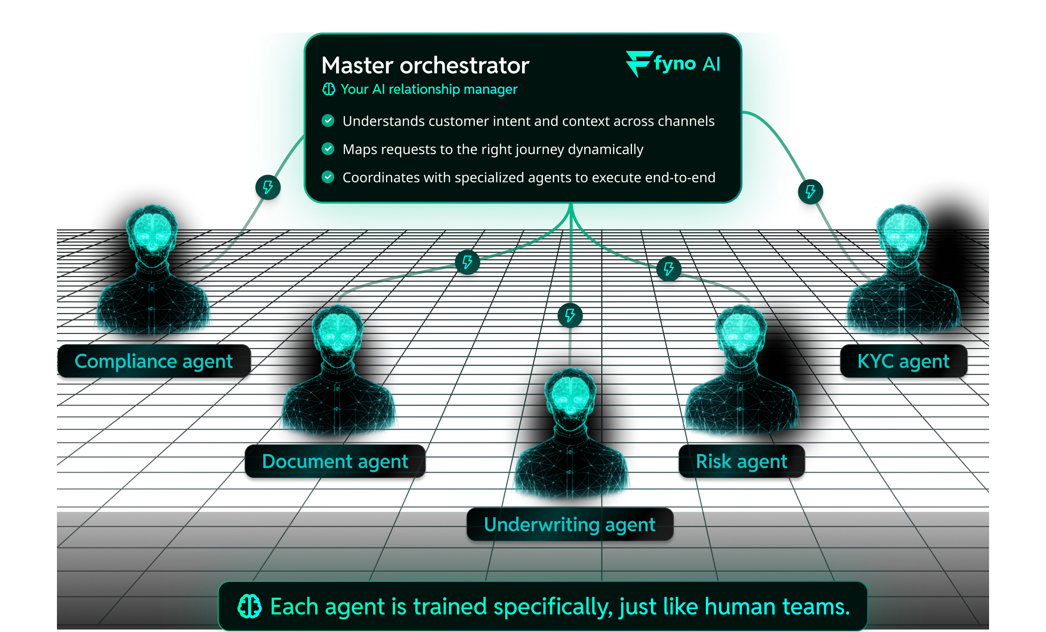 Yes, and this is a core part of how Fyno deploys. The agent architecture is consistent, but the journeys, including the rules, document types, decisioning logic, and escalation paths, are configured to your workflows. Fyno does not ask you to adapt to a pre-built product. Onboarding, lending, and servicing journeys are built in close collaboration with your product and ops teams during implementation.