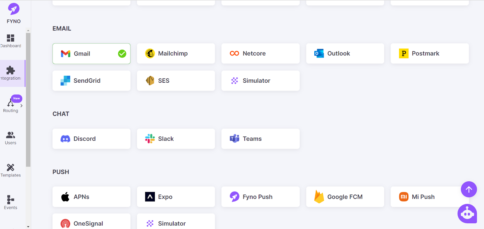 Fyno provides a ready-to-integrate provider list to integrate with emails, including Gmail, Mailchimp (Mandrill), Mailgun, Netcore, Outlook, Postmark, and SendGrid.