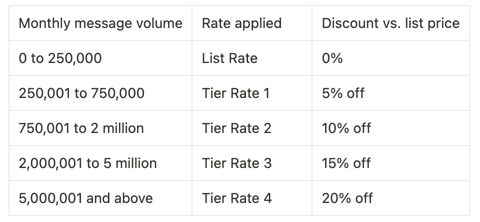 Once your messages in that category cross a certain threshold, you unlock discounted rates for any further messages