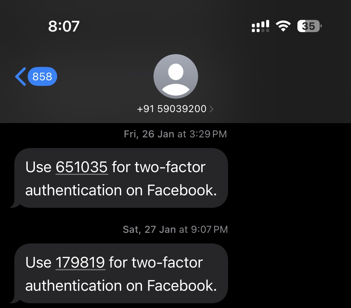 Under this route, they are forced to use random numbers to send messages in India, which can confuse customers and erode trust (see Figure 1 below for a screenshot of SMS from Facebook under the ILDO route). This also costs them ~ INR 4 for each SMS. Whenever you trigger a 2-factor authentication code via SMS from Facebook or Google, they spend ~ INR 4 to send you the code.