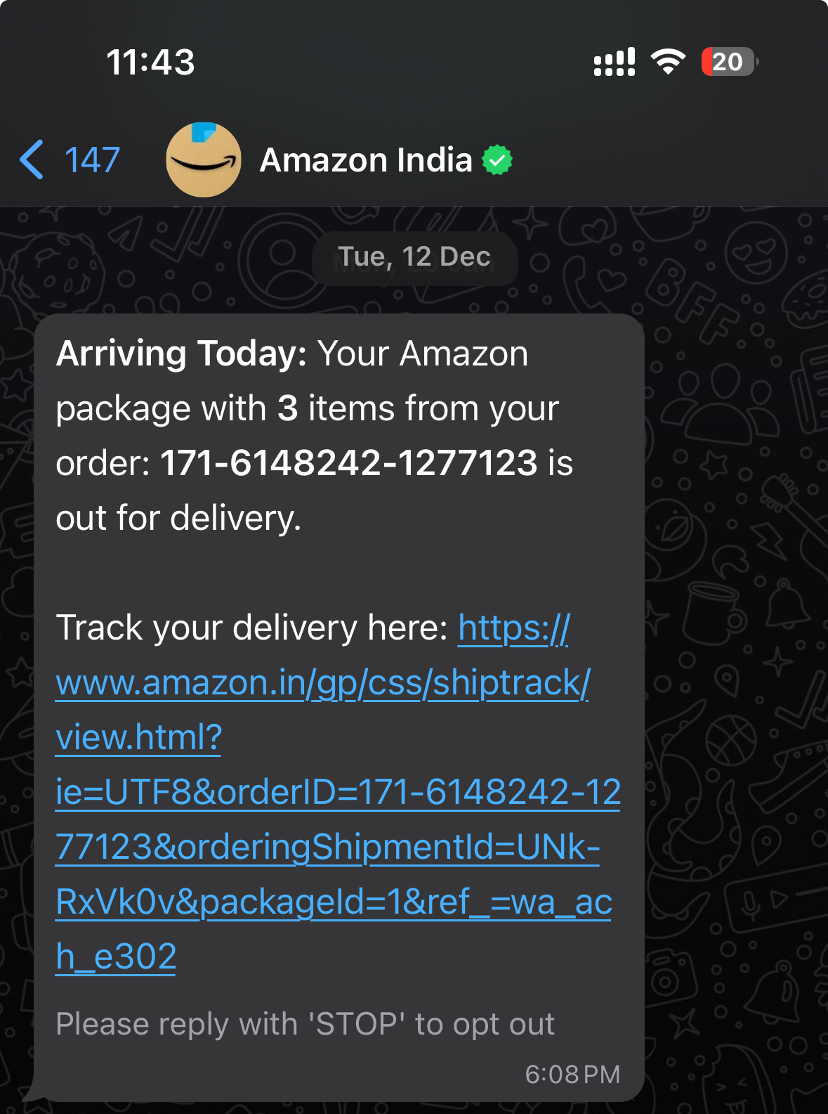 Fig 2: Amazon sending transactional alerts to users in India using Whatsapp